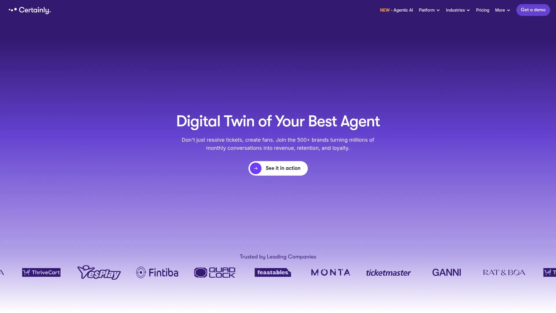 Certainly is an AI agent platform that creates digital twins of customer service agents to handle complex, multi-step tasks autonomously. It instantly resolves support tickets, provides personalized e-commerce assistance, and drives customer engagement across multiple channels. Best for leading brands seeking to scale customer interactions. Enterprise-grade solution with custom pricing.