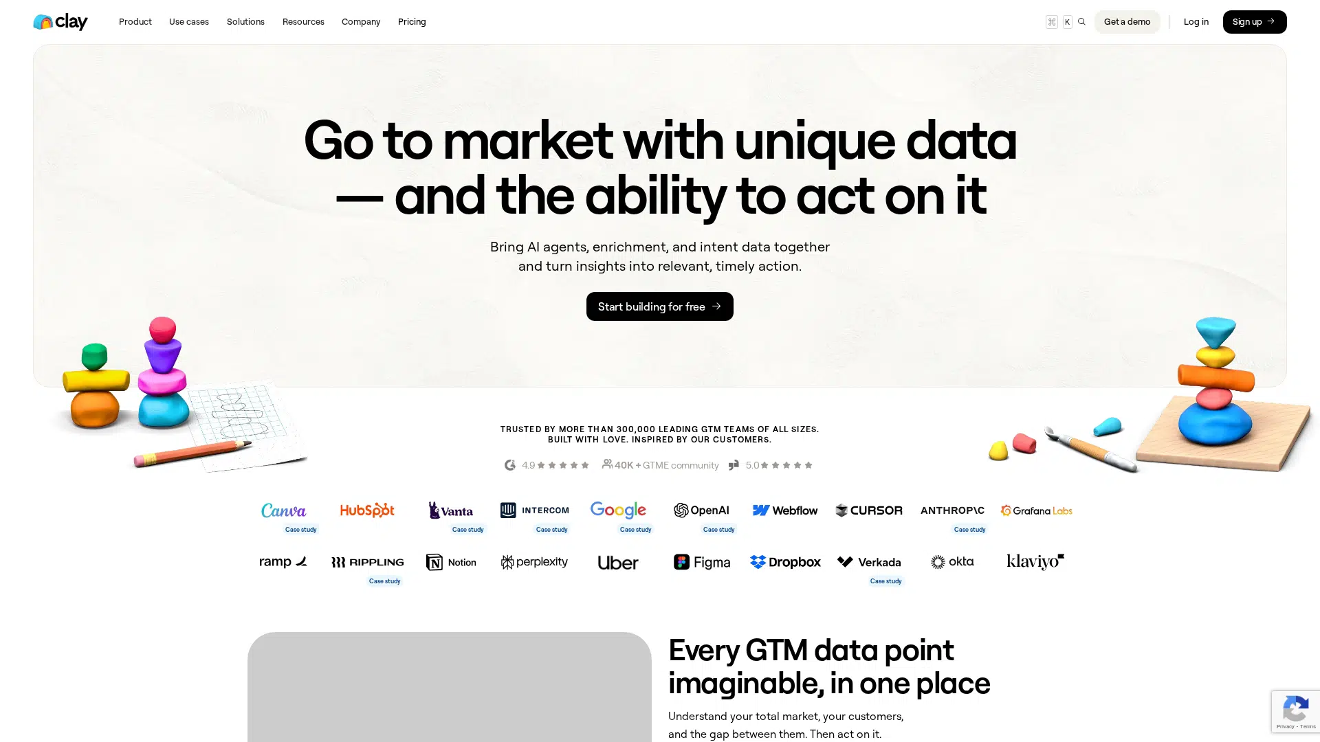Clay uniquely combines an AI agent (Claygent) for custom web research and a natural language workflow builder (Sculptor) with access to over 150 data providers, enabling highly contextual and automated GTM strategies.