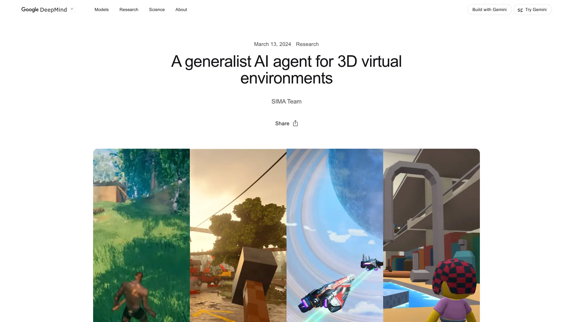 SIMA is a generalist AI agent capable of playing, reasoning, and learning across a diverse range of 3D virtual environments, demonstrating adaptable intelligence beyond single-task specialization.