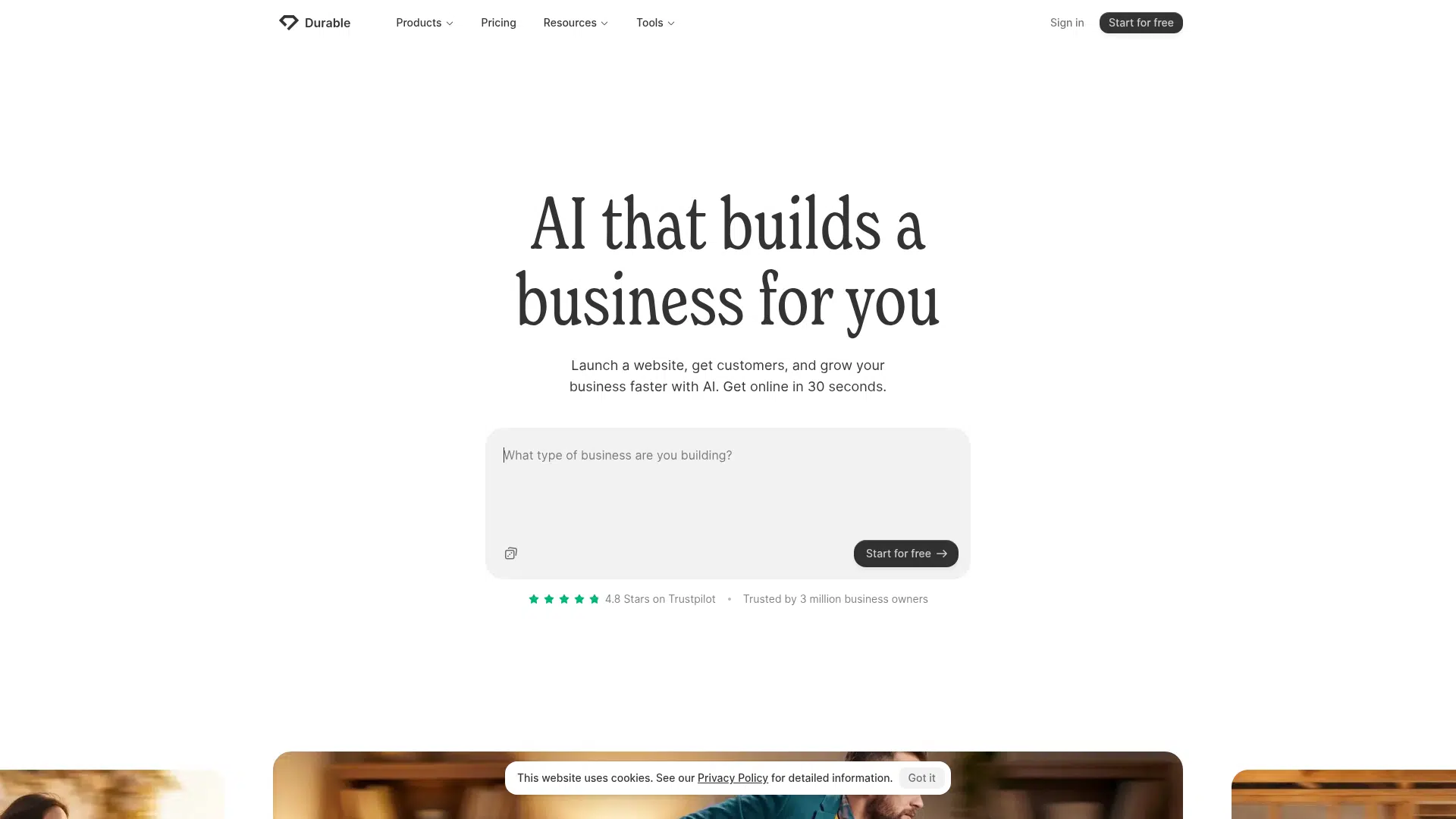 Durable AI is an AI business builder that helps entrepreneurs launch and grow their businesses with an AI website builder, CRM, invoicing, and marketing tools. It generates websites in 30 seconds, creates on-brand content, and provides personalized business advice. Best for small business owners and service providers, it offers a freemium model with paid plans starting at $22/month.