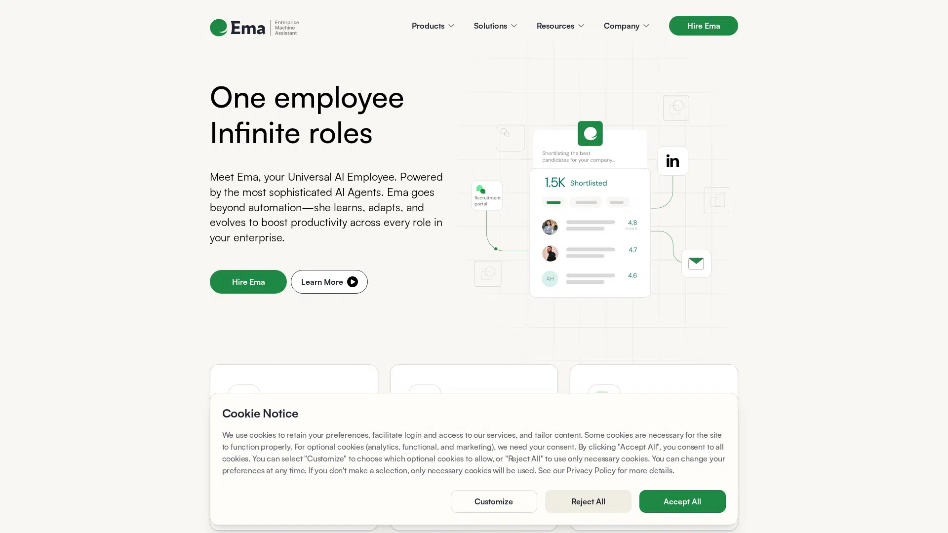 Ema's Generative Workflow Engine⢠allows conversational activation of AI employees for complex workflows, while its proprietary EmaFusion⢠model intelligently blends over 100 public and private LLMs for maximized accuracy and cost efficiency.