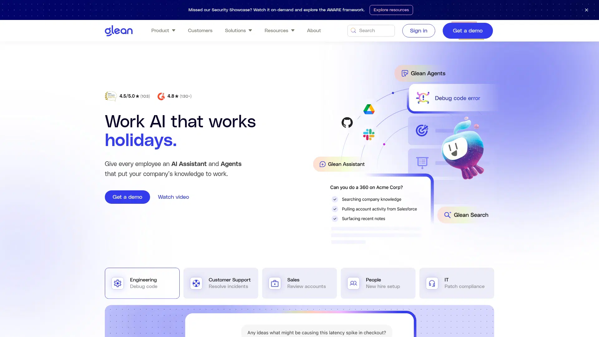 Glean AI is an enterprise Work AI platform that provides a personal AI assistant, custom AI agents, and powerful workplace search. It unifies company knowledge across 100+ applications, enabling employees to find information, generate content, and automate workflows securely. Designed for large organizations, it offers a centralized platform for deploying AI with real-time permissions.