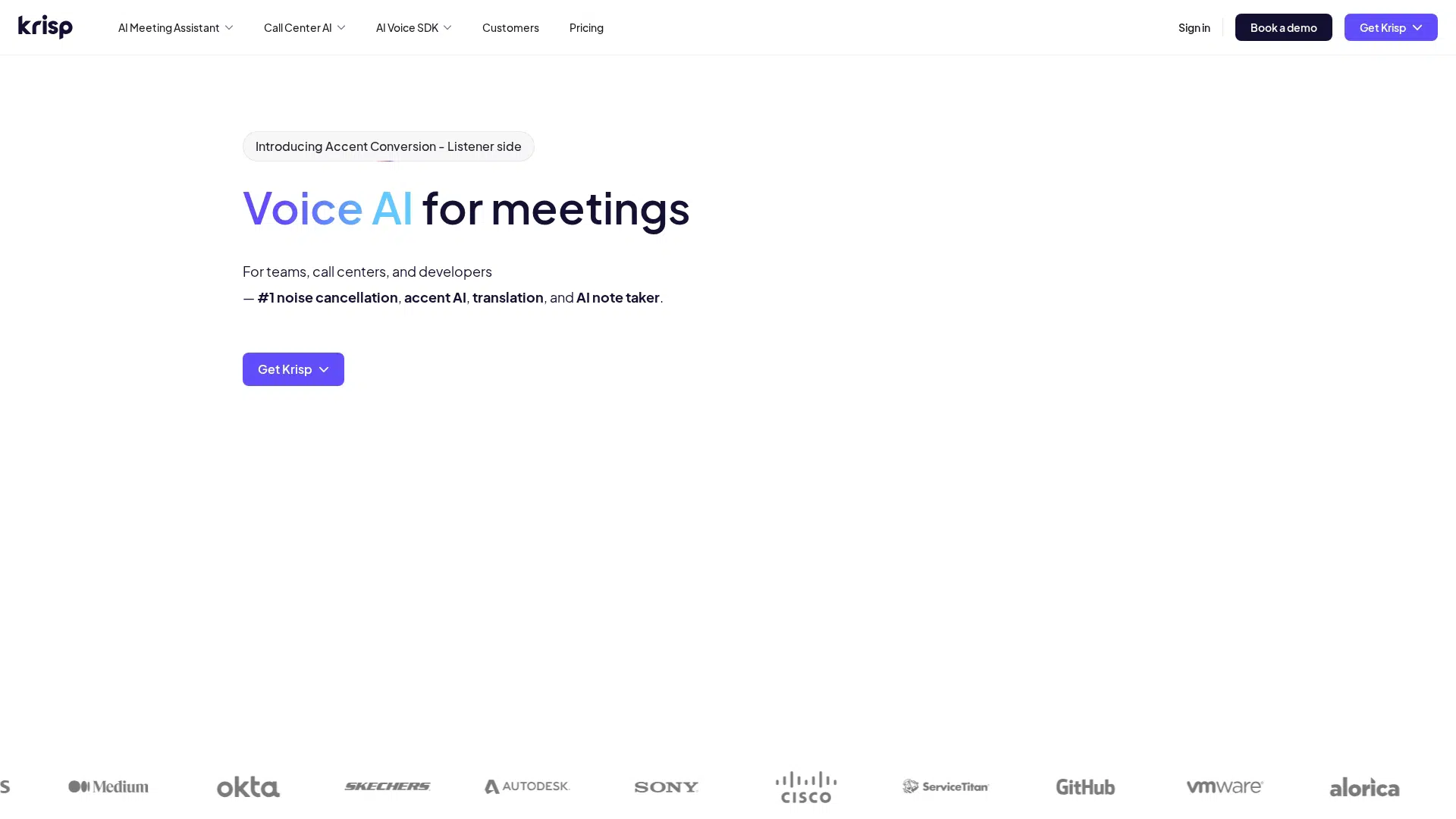 Krisp is a Voice AI platform that makes conversations clearer and more productive for individuals, teams, call centers, and developers. It offers industry-leading noise cancellation, real-time accent conversion, and AI-powered meeting notes and summaries. Available with a freemium model and robust enterprise security.