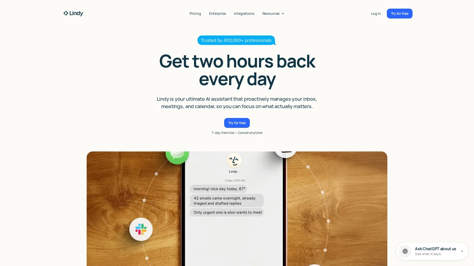 Lindy is an AI assistant that proactively manages your inbox, meetings, and calendar, helping professionals save significant time on administrative tasks. It drafts emails, preps meetings, and learns your preferences over time. Integrates with hundreds of apps and offers enterprise-grade security. Try for free.
