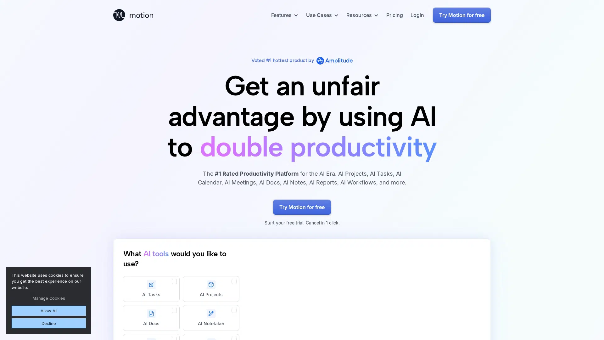 Motion is an AI-powered productivity platform for individuals and teams that automatically plans projects, prioritizes tasks, and schedules meetings. It unifies project management, task management, calendar, and document tools into a single AI-driven workspace. Motion offers a free trial and paid plans starting from $19/month.