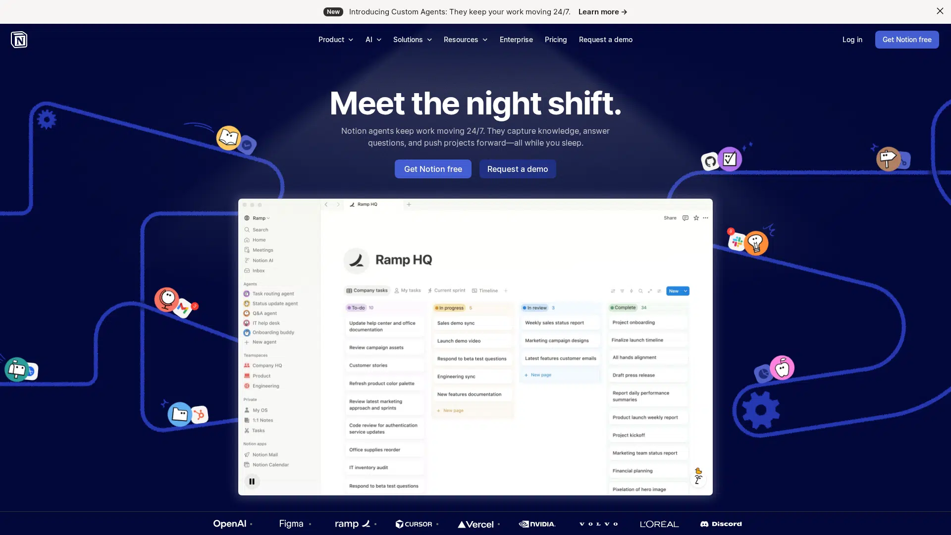 Notion AI Agent is an AI workspace feature that automates repetitive tasks, answers questions, and generates reports using your team's knowledge. It includes Custom Agents for multi-step workflows, AI Meeting Notes, and Enterprise Search across connected apps. Available as part of Notion's Business and Enterprise plans, with a free trial.