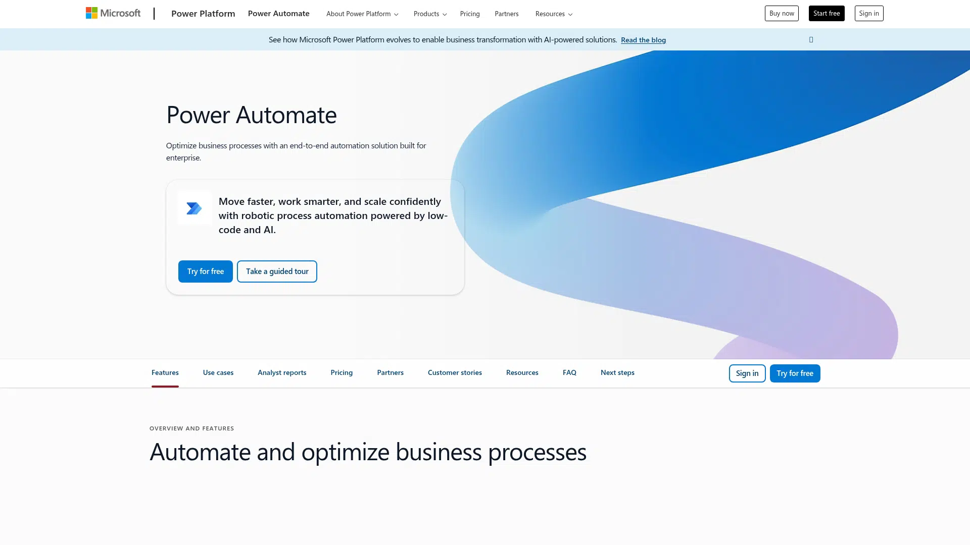 Power Automate is a Microsoft Power Platform service for automating repetitive tasks and business processes. It enables users to create AI-powered workflows, integrate with hundreds of services, and streamline operations across their organization. It supports both cloud flows and desktop flows, enhancing productivity for businesses of all sizes.