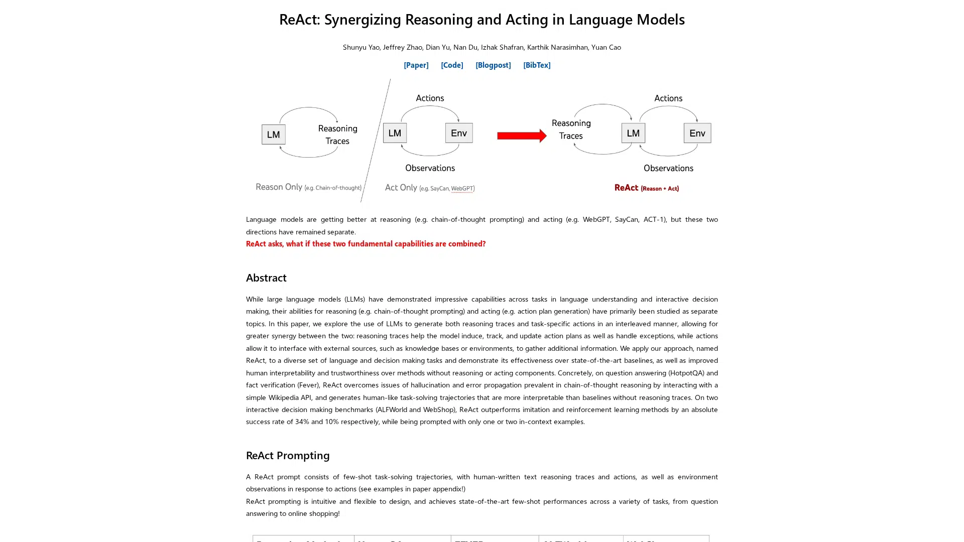 ReAct is a prompting technique and framework that combines reasoning traces and task-specific actions in large language models. It allows LLMs to generate both thoughts and actions in an interleaved manner, enhancing problem-solving, reducing hallucination, and improving interpretability. This research project demonstrates state-of-the-art few-shot performance across various language and decision-making tasks.