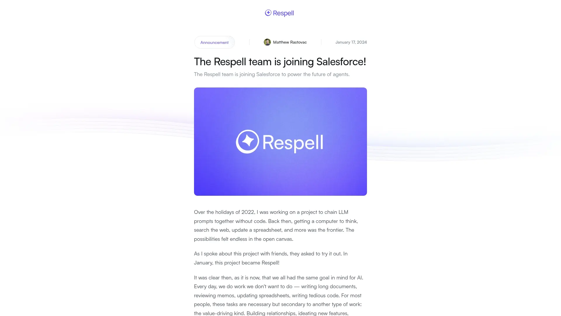 Respell was an AI-first automation suite designed to chain large language model prompts together without code, enabling professionals to automate tedious tasks like writing documents, reviewing memos, updating spreadsheets, and generating code. The Respell team is joining Salesforce's Agentforce, and the standalone product will be shutting down on March 1st, 2024.