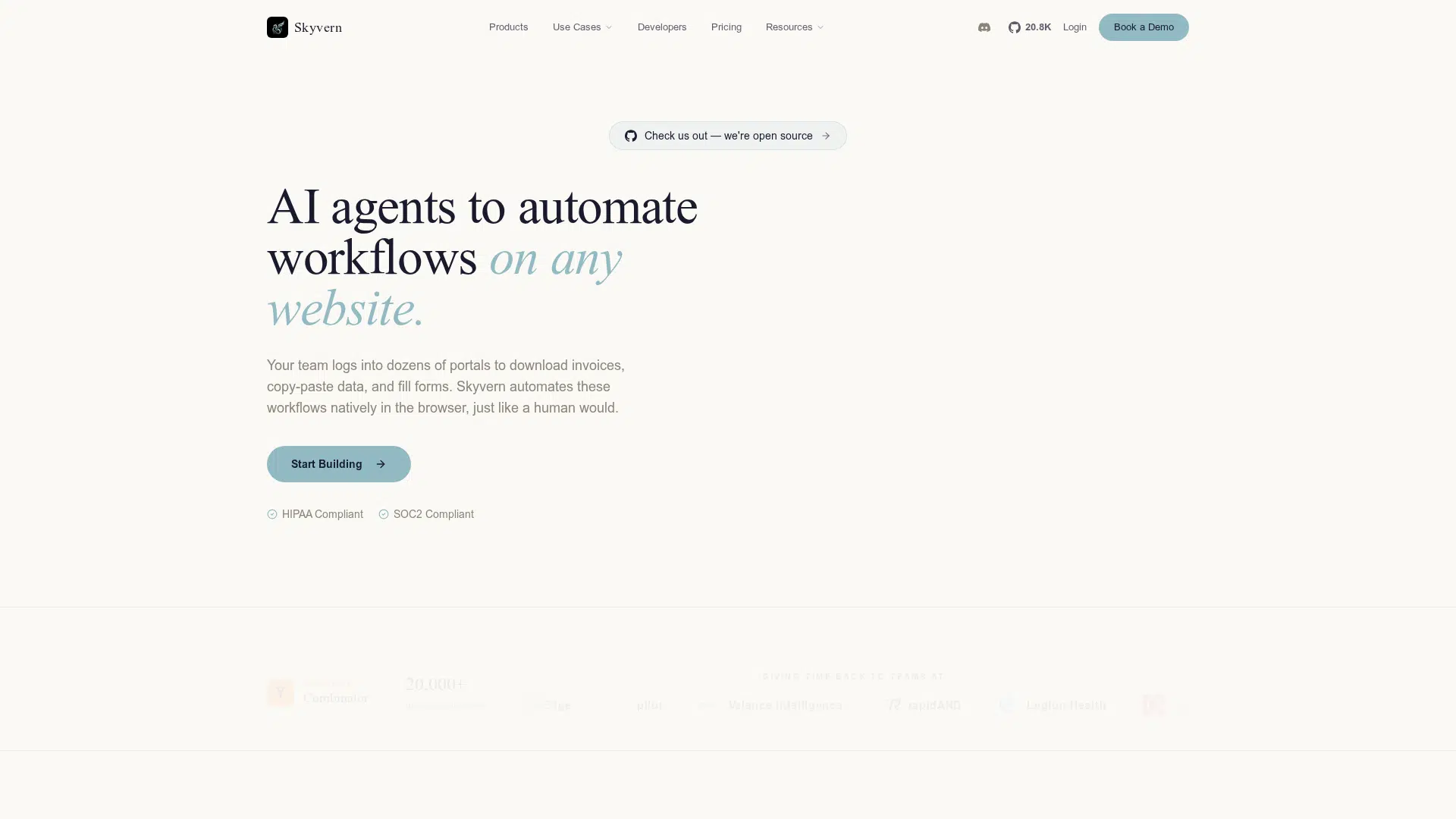 Skyvern is an AI agent platform that automates complex browser-based workflows using LLMs and computer vision. It handles tasks like data extraction, form filling, and document processing, adapting to UI changes and bypassing CAPTCHAs and 2FA. Designed for developers and operations teams, it offers both cloud and on-premise deployment options.