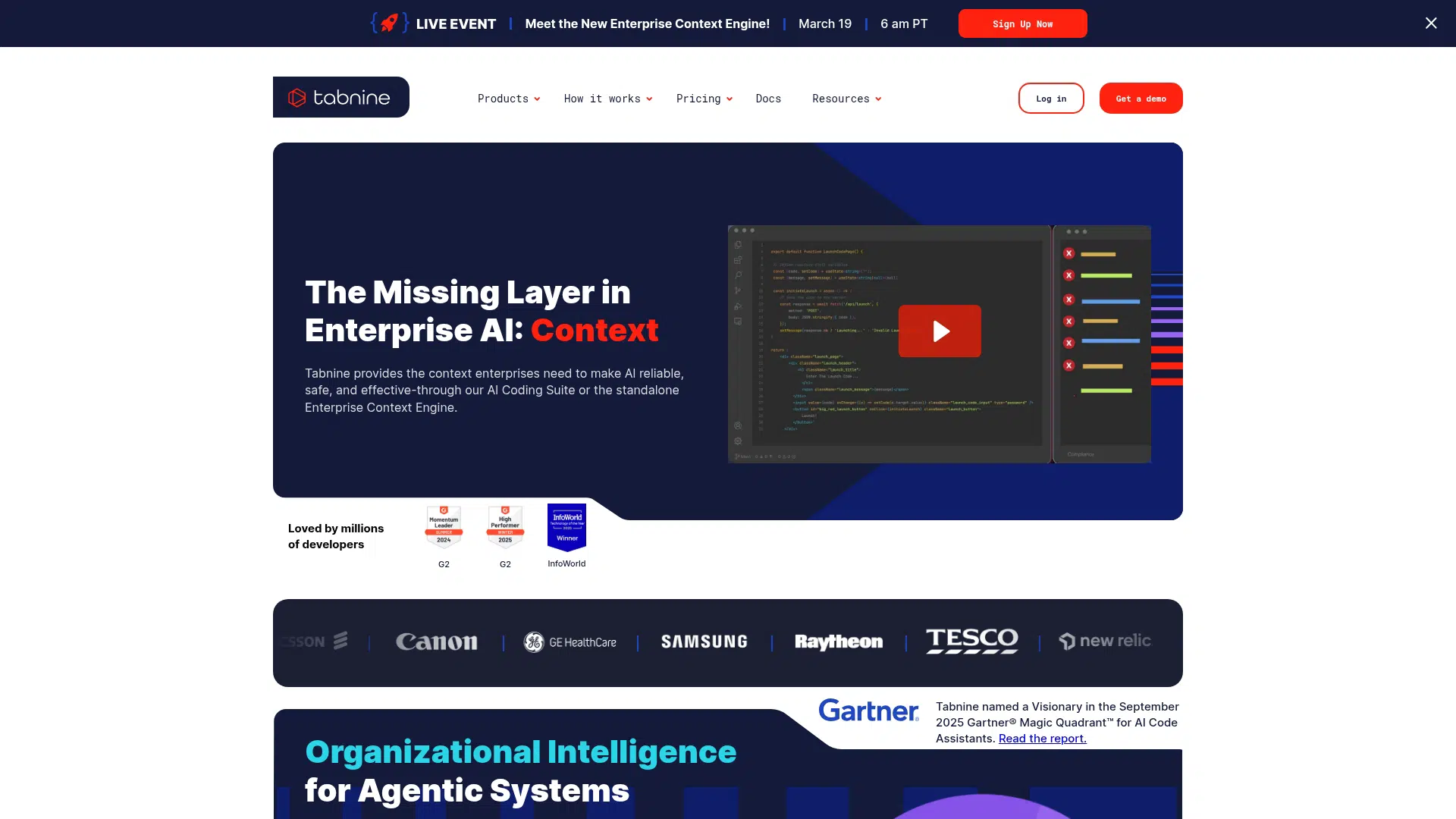 Tabnine's Enterprise Context Engine provides organizational intelligence, allowing AI agents to understand unique architecture, frameworks, and coding standards, adapting to mixed stacks and legacy systems for enterprise-ready, governed AI coding.