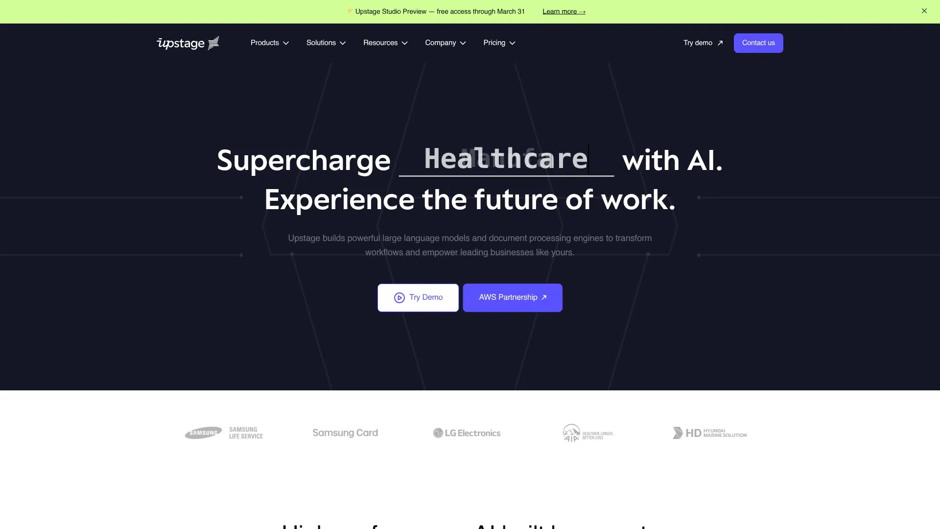 Upstage is an enterprise-grade AI platform offering powerful large language models and document intelligence solutions. It provides tools for converting complex documents, extracting structured data, and building AI agents for workflows. Best for businesses in high-stakes industries like finance and healthcare. Offers usage-based pricing with commitment tiers and on-premise deployment options.