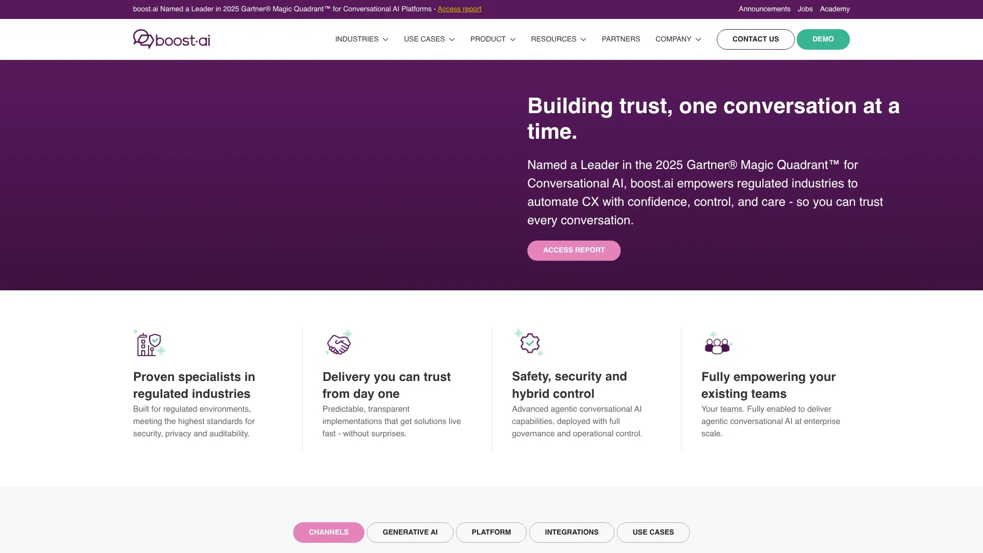 Boost.ai specializes in providing enterprise-grade conversational AI for highly regulated industries, offering a unique hybrid AI approach that combines predefined responses with large language models for full governance and operational control.