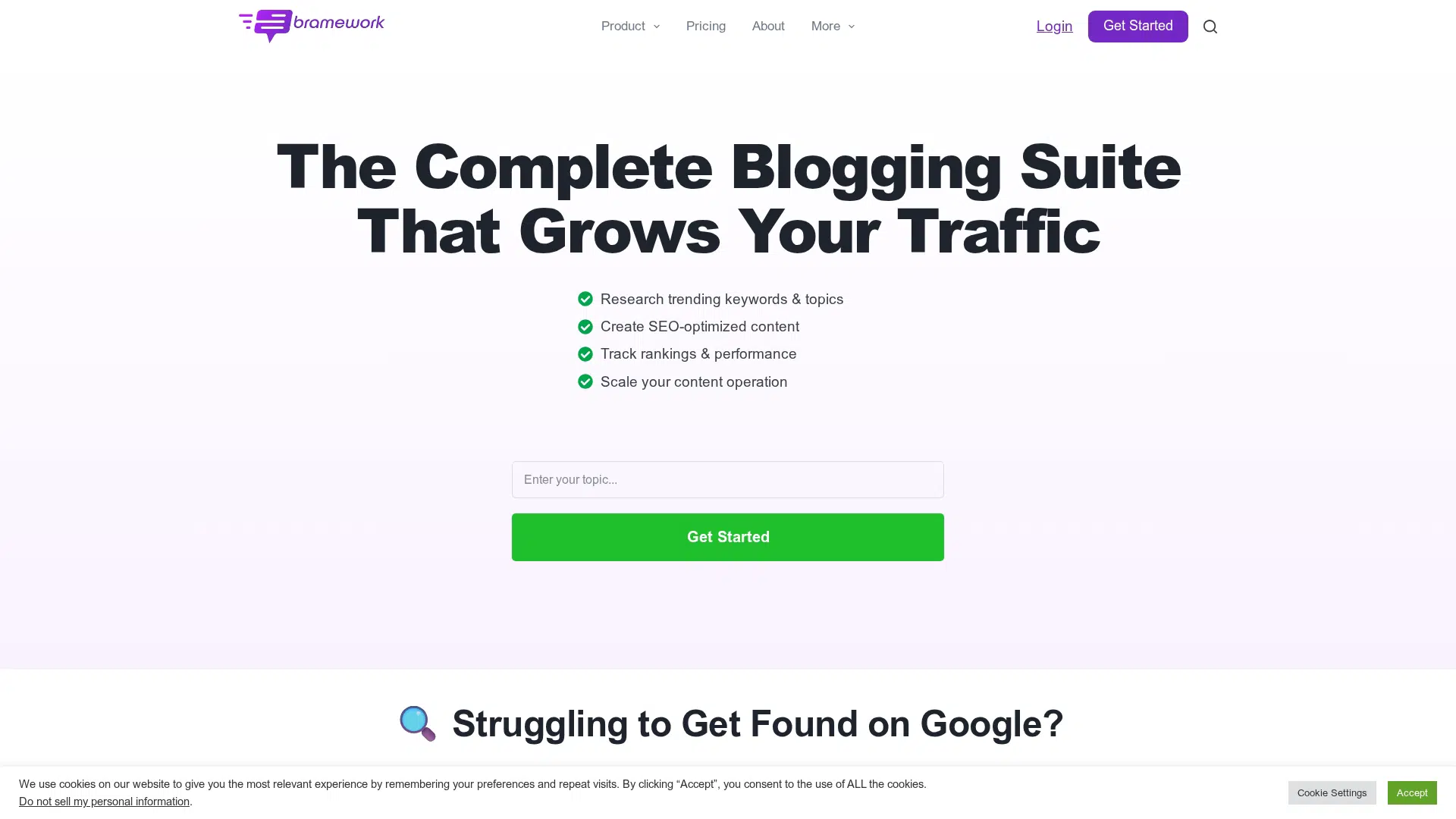 Bramework is an AI writing tool for bloggers and agencies that helps research keywords, generate SEO-optimized content, and track performance. It offers features like First Draft PRO for long-form posts and integrations with Google Analytics. Plans start from $19/month.