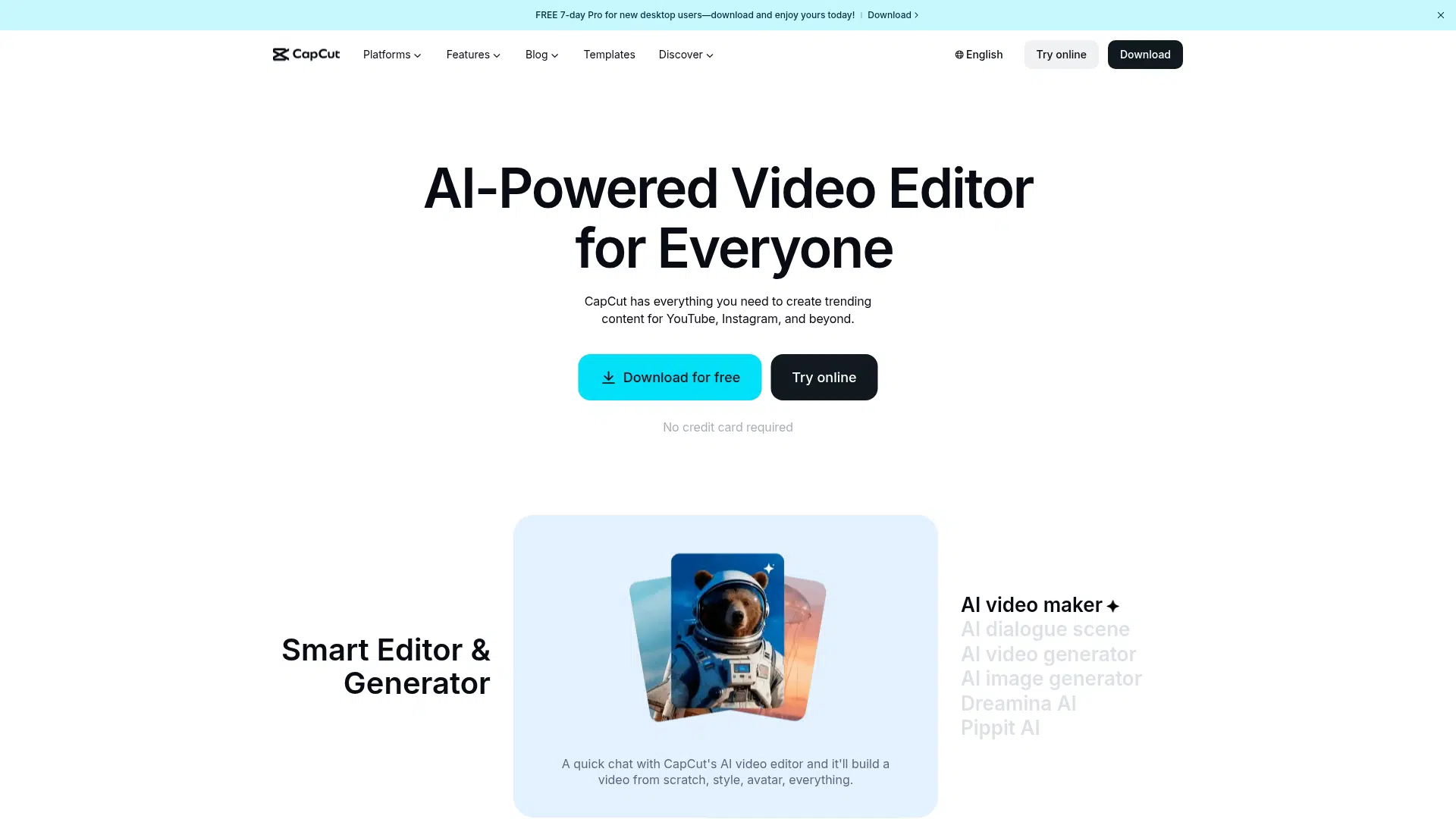CapCut AI is a versatile video and image editor for content creators and marketers, offering AI-powered generation and smart editing features. It helps users create trending content for social media platforms like YouTube and Instagram with ease. Available across desktop, web, and mobile, CapCut provides a free tier with a 7-day Pro trial for desktop users.