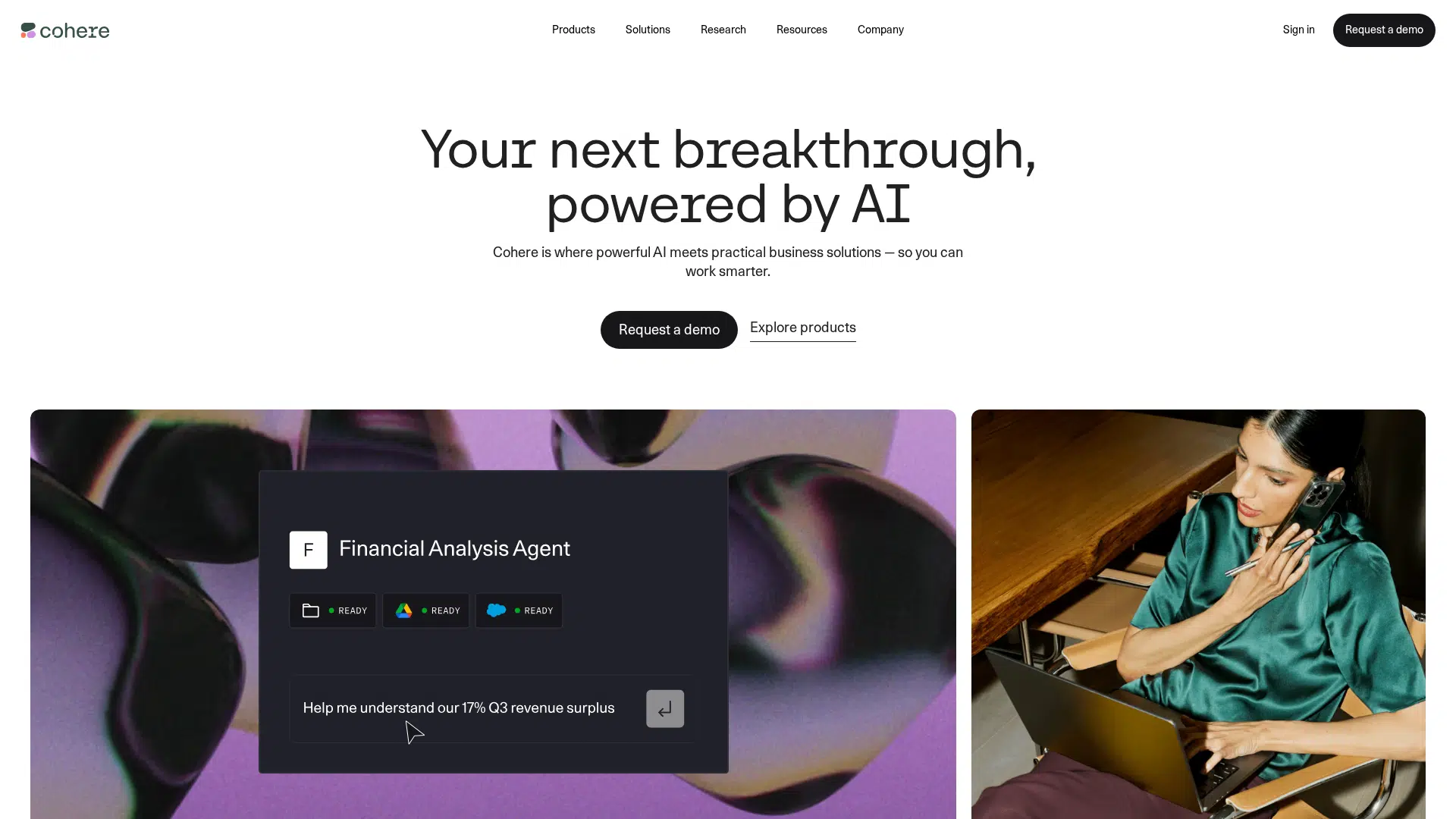 Cohere offers enterprise-ready AI solutions, including high-performance generative and advanced retrieval models, designed to accelerate growth and productivity. It provides a secure, scalable platform for building custom AI applications, surfacing business insights, and automating complex workflows. Pricing is usage-based with custom enterprise options.