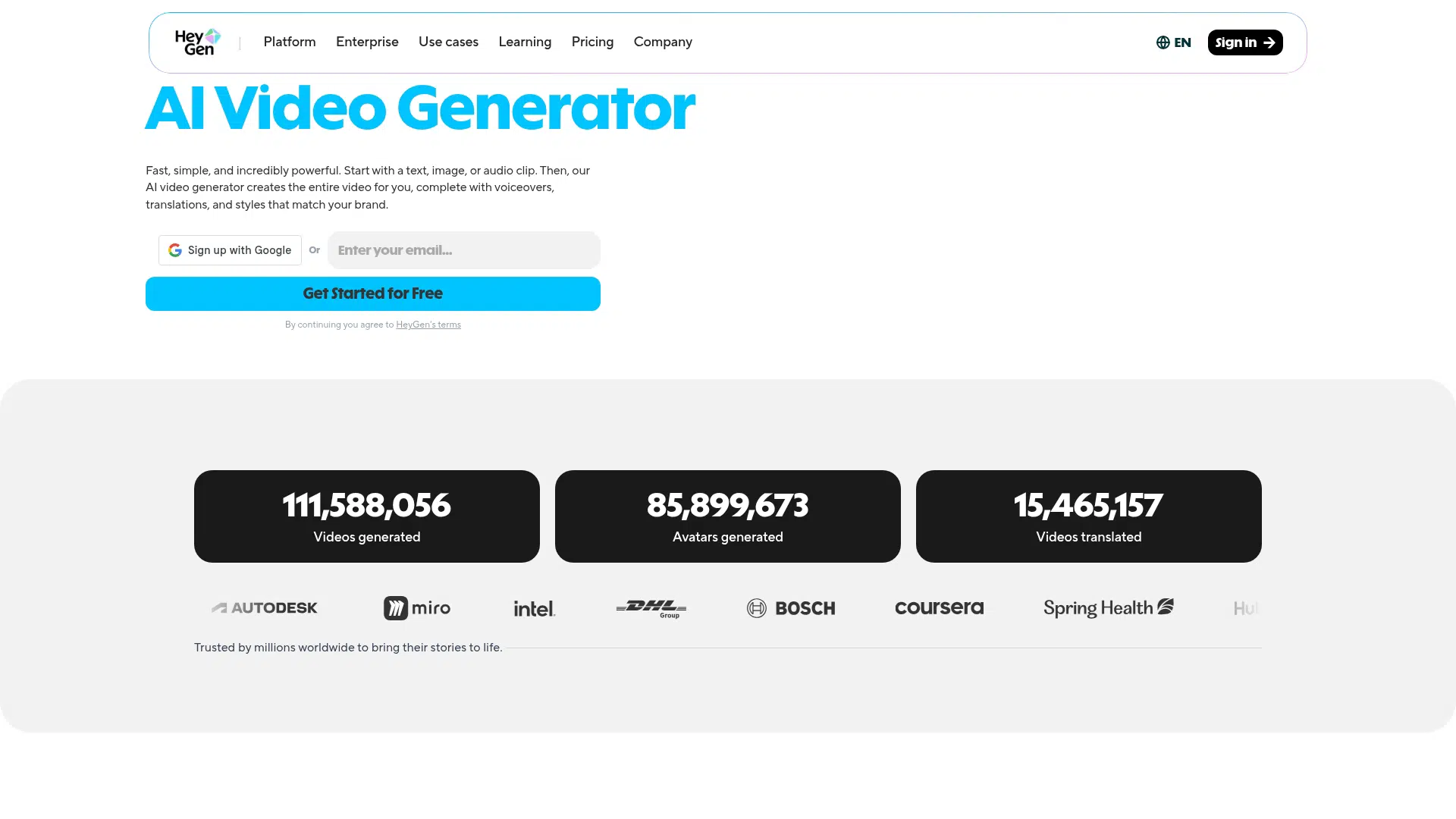 HeyGen is an AI video generator that creates professional videos from text, images, or audio using realistic avatars, voiceovers, and multilingual translation. It's best for marketers, L&D teams, and sales professionals needing to scale video content quickly and efficiently. A free plan is available, with paid plans starting from $29/month.