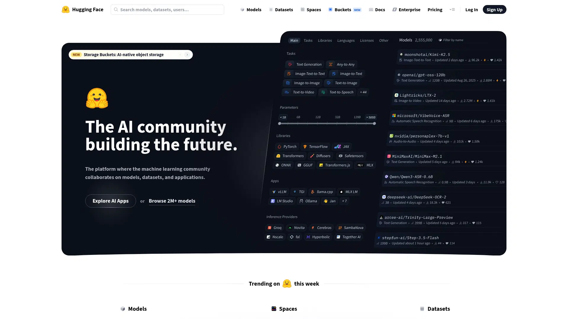 Hugging Face stands out as the central hub for the open-source machine learning community, offering a Git-based platform for hosting and collaborating on millions of public and private models, datasets, and applications, alongside a comprehensive open-source stack of ML libraries like Transformers and Diffusers.
