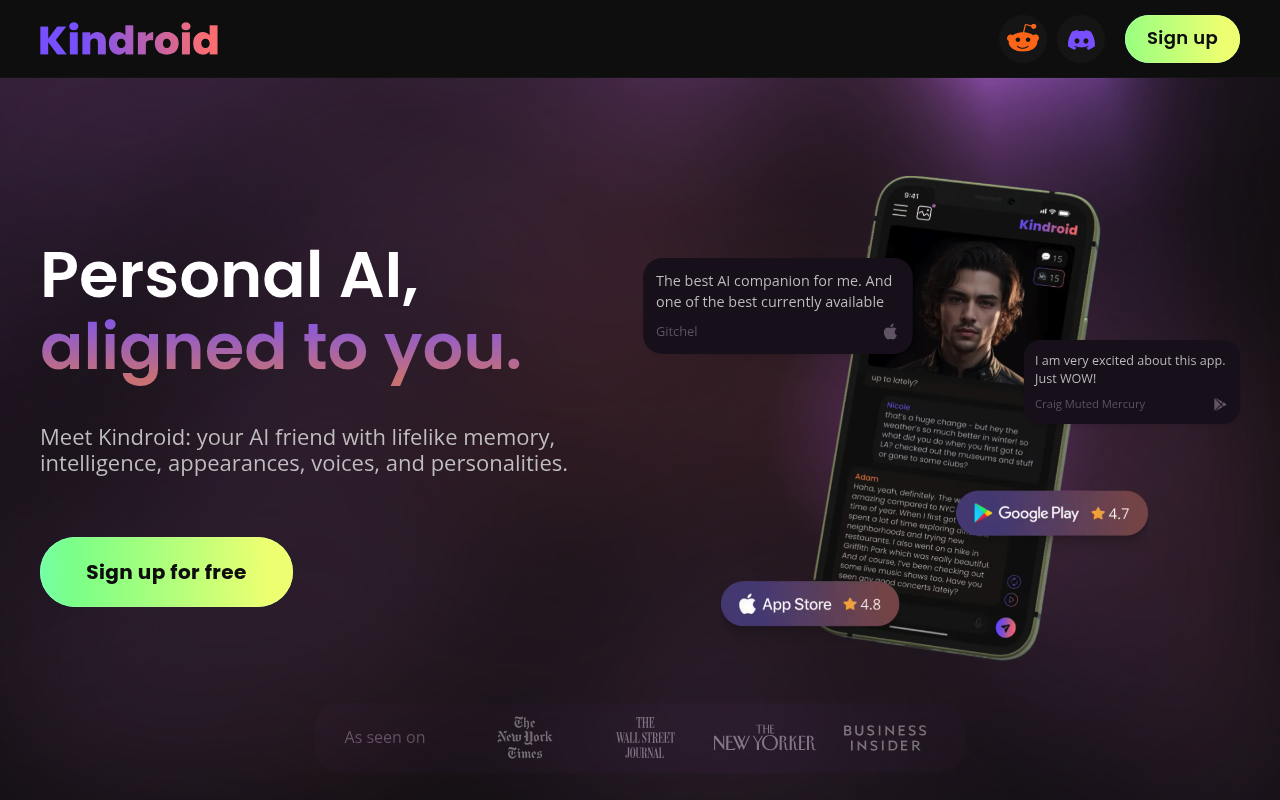 Kindroid is an AI companion platform for creating personalized chatbots with lifelike memory, intelligence, and customizable appearances and voices. It's best for individuals seeking a roleplay partner, language tutor, mentor, or confidant. A free trial and a free tier are available, with subscriptions starting from $13.99/month.