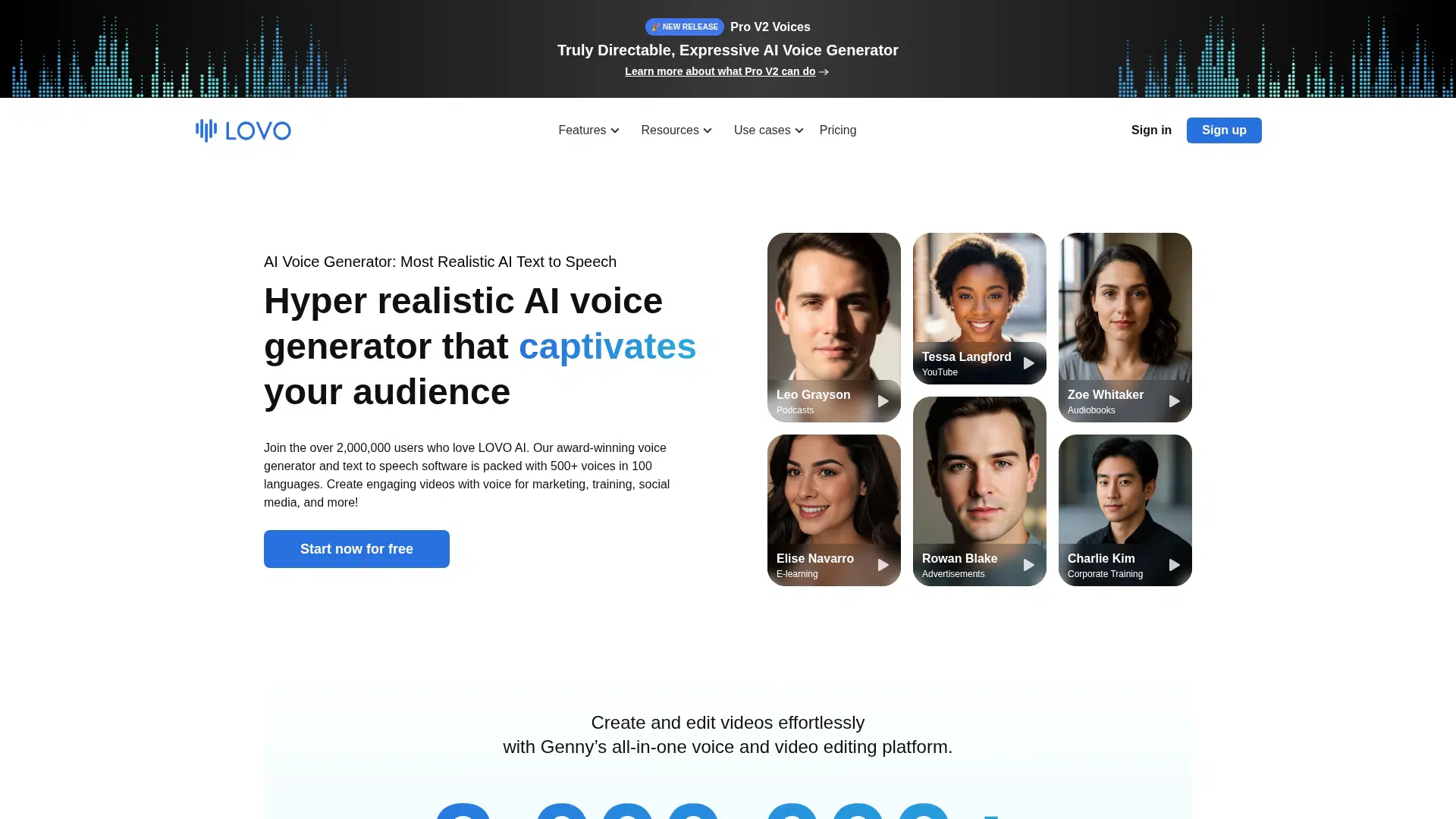 LOVO AI offers "Pro V2 Voices" which are described as truly directable and expressive, allowing for natural language control over emotions, speaking speeds, and accents, combined with an all-in-one video editing platform.