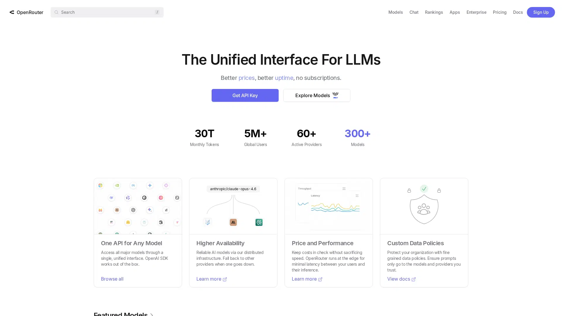 Access any LLM with a unified API, offering better prices and higher uptime.