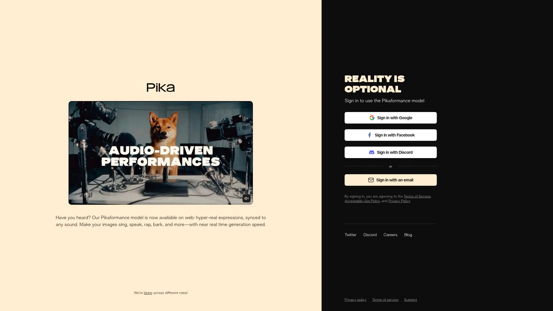 Pika Labs features the Pikaformance model, enabling hyper-real expressions synced to any sound with near real-time generation speed, a unique capability for dynamic video creation from static images.