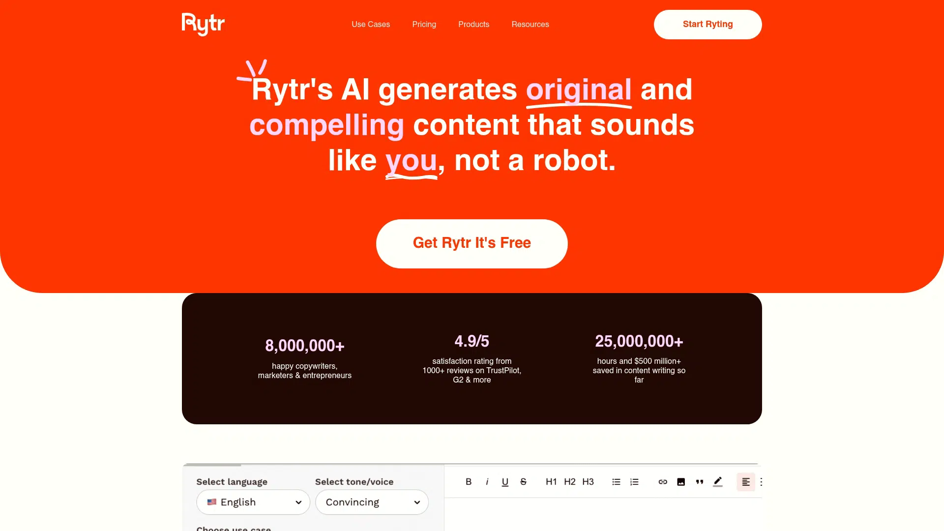 Rytr is an AI writing assistant for copywriters, marketers & entrepreneurs that generates original and compelling content. It offers 40+ use cases, custom tone of voice matching, and a Chrome extension for writing anywhere. Free to try; Unlimited plan from $7.50/month.