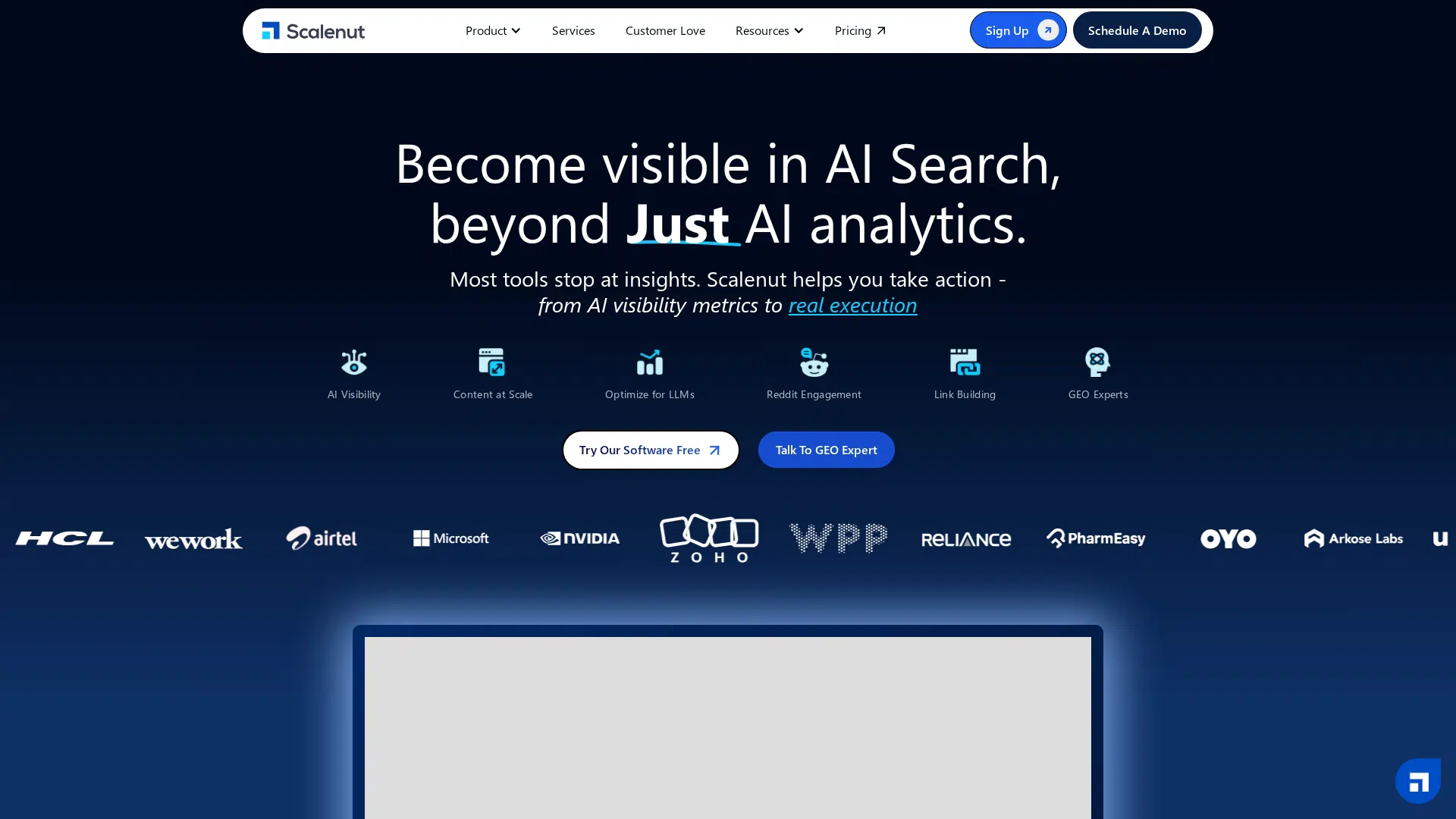 Scalenut goes beyond AI visibility metrics by providing actionable recommendations and built-in tools for execution, including a GEO content engine, content optimizer, and a backlinks marketplace, all structured for AI answers.
