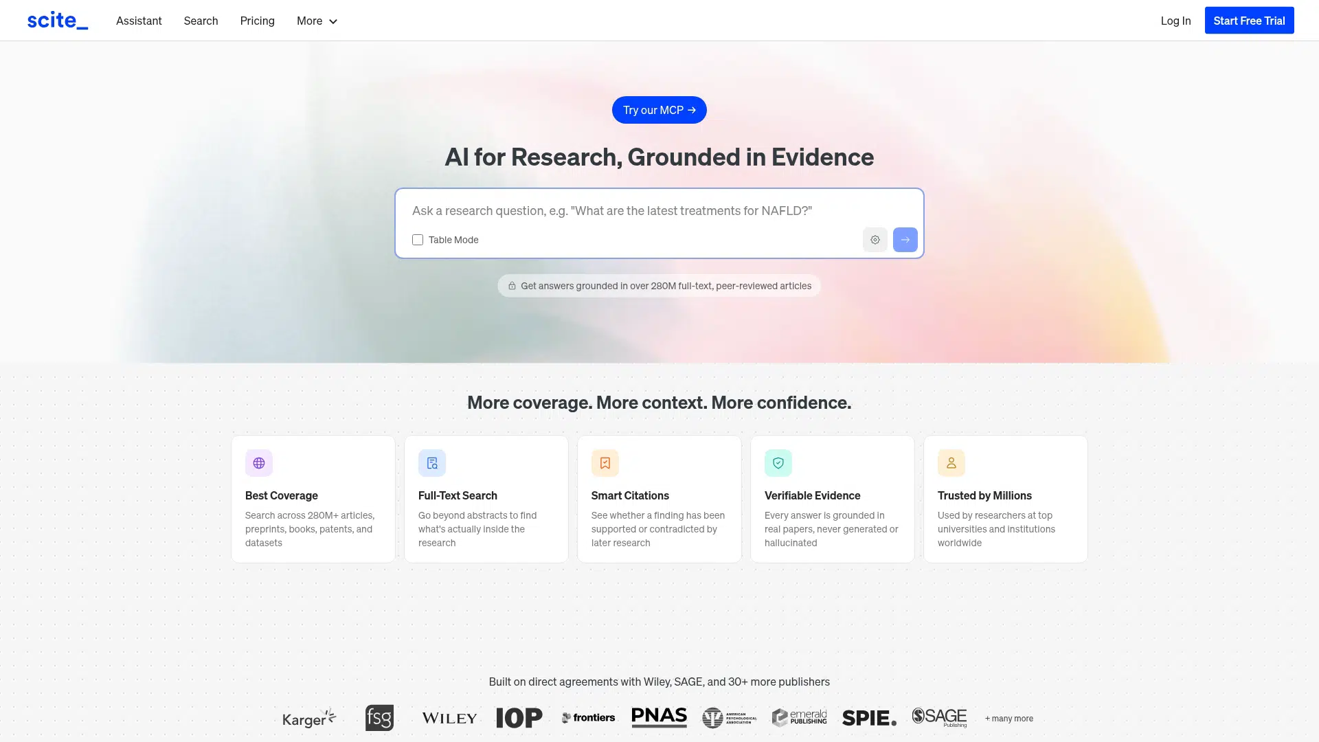 Scite AI is an AI-powered platform for researchers to discover and evaluate scientific literature. It offers full-text search across 280M+ articles and uses Smart Citations to show whether findings are supported or contradicted by later research. A 7-day free trial is available, with a Personal plan starting from $20/month.