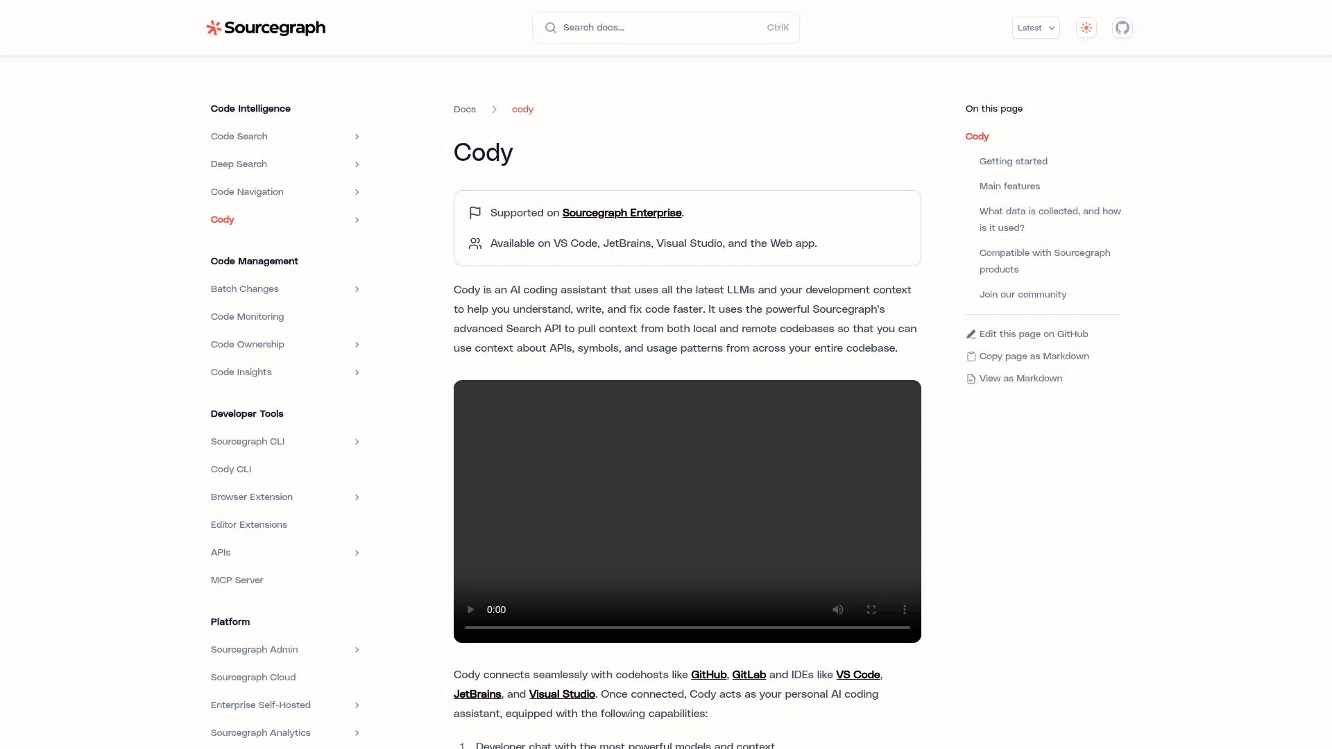 Sourcegraph Cody provides extensive code context from both local and remote codebases, including APIs, symbols, and usage patterns, directly within the developer's editor, enhancing AI agent accuracy and output quality.