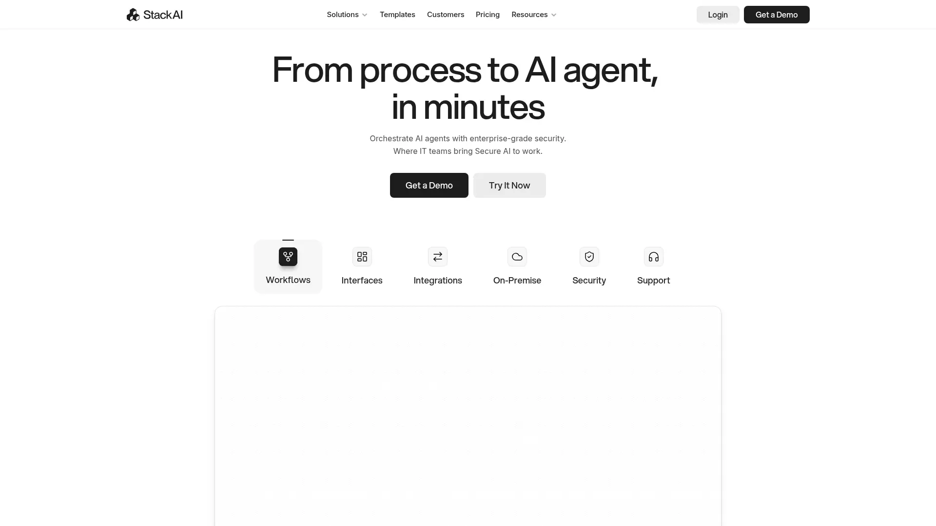 Stack AI offers enterprise-grade security and flexible deployment options including on-premise and VPC, combined with a no-code/low-code platform for rapid agent development and over 100 native integrations.