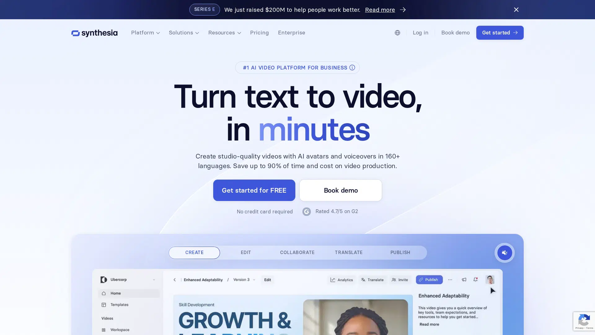 Synthesia is the #1 AI video platform for businesses, enabling users to create professional videos with AI avatars and voiceovers in 160+ languages. It helps teams scale video content creation, saving up to 90% of time and cost on production. A free plan is available, with paid plans starting from $18/month.