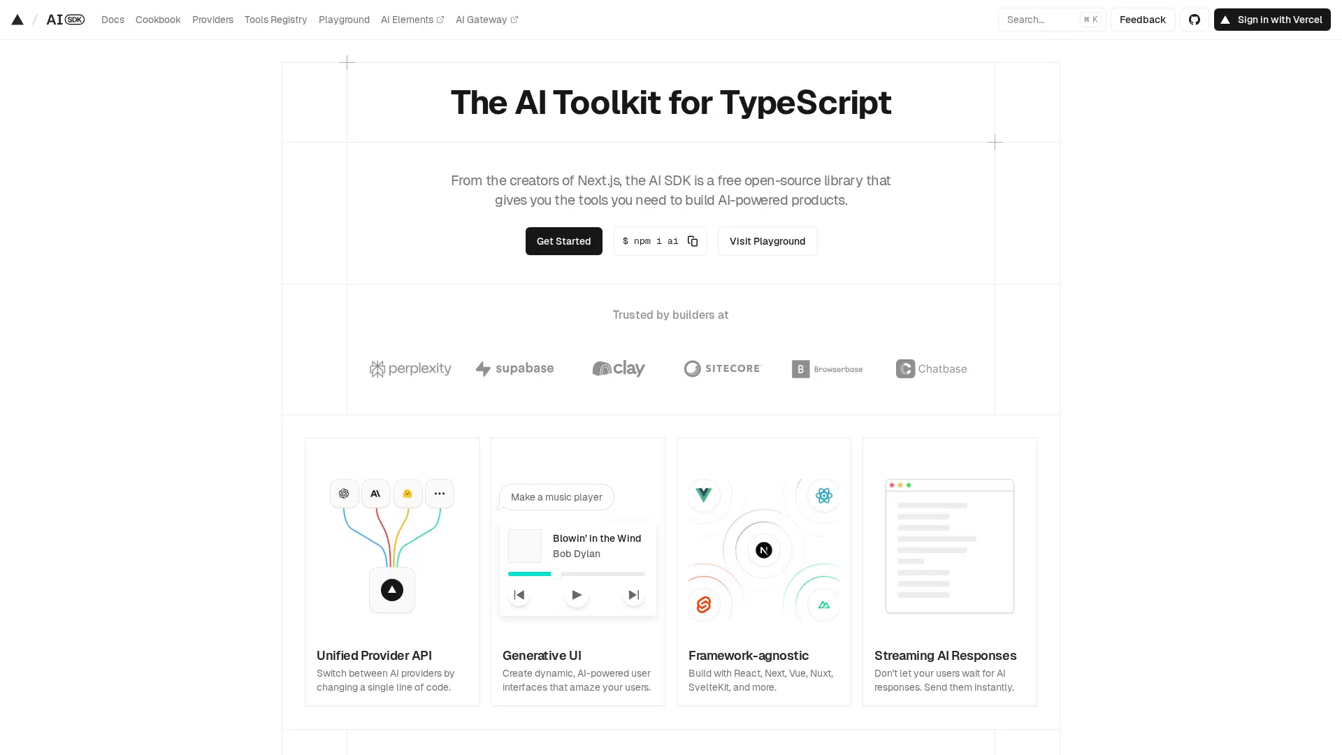 The Vercel AI SDK is a free, open-source TypeScript library for building AI-powered applications and agents. It provides tools for generative UI, streaming AI responses, and switching between various AI model providers with a unified API. Designed for developers, it integrates seamlessly with frameworks like Next.js, React, Vue, and SvelteKit.