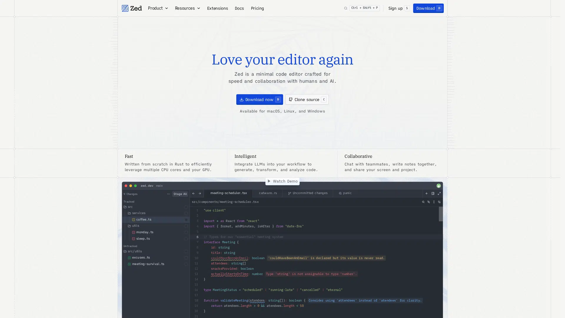 Zed is a hyper-responsive code editor built in Rust for speed, collaboration, and AI-powered development. It features agentic editing, native Git support, and real-time multiplayer collaboration. Designed for developers, it offers a free plan and a Pro plan with hosted AI models.